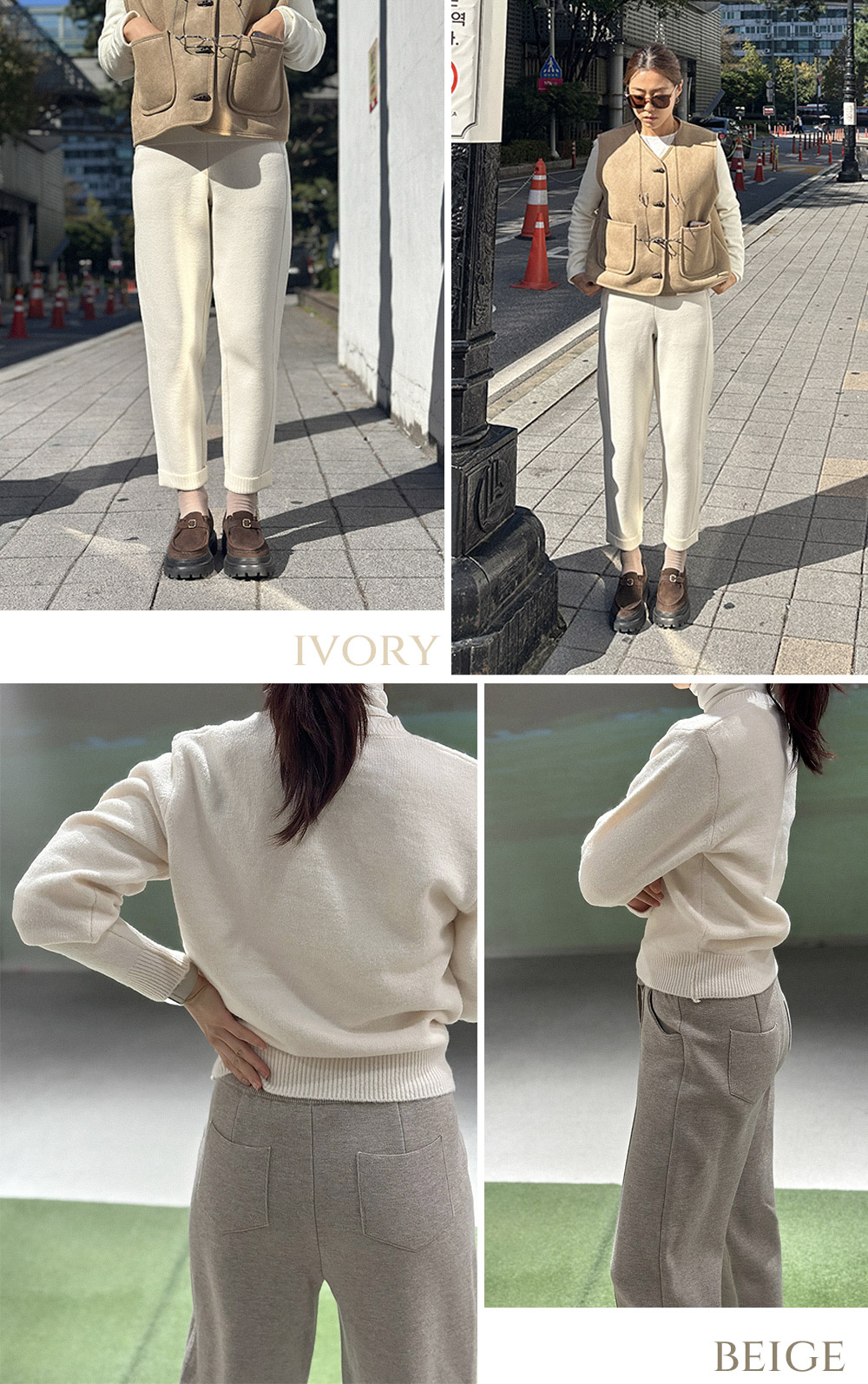 고급스러운 니트 컬러들의 만남이 룩을 한층 멋스럽게 만들며